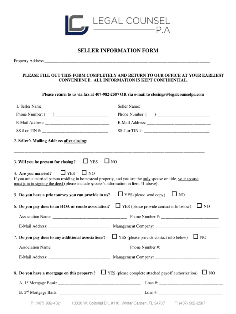 SELLER INFORMATION FORM Property Address: PLEASE FILL OUT THIS FORM COMPLETELY AND RETURN TO OUR OFFICE AT YOUR EARLIEST CONVENIENCE. ALL INFORMATION IS KEPT CONFIDENTIAL. Please return to us via