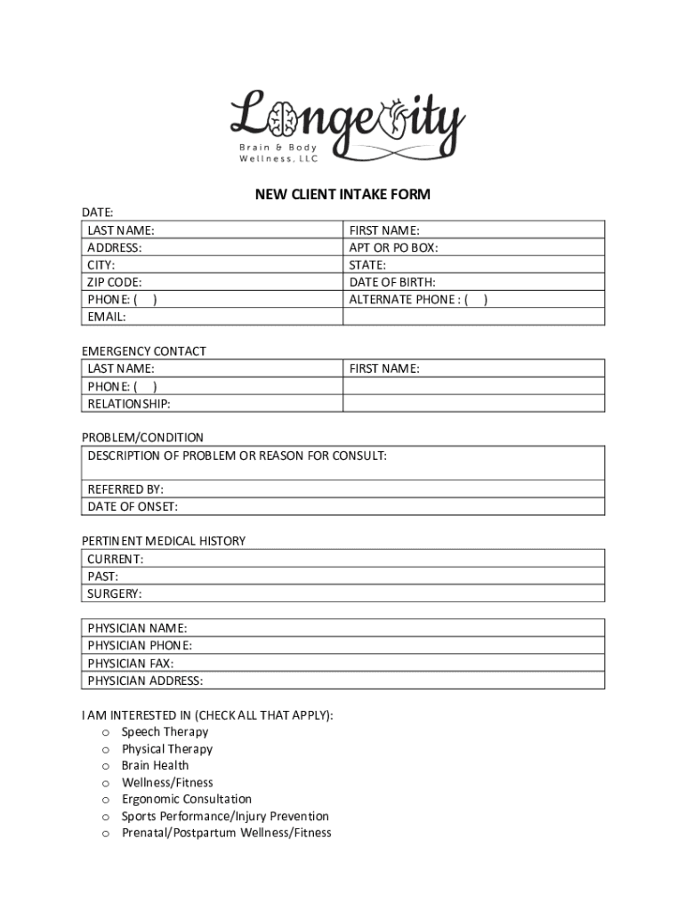 The New Client Intake Form should be completed by all new patients seeking services from healthcare providers for each new consultation.