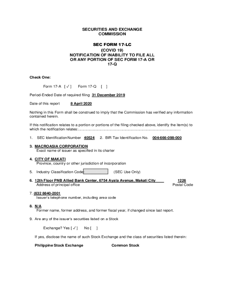 SECURITIES AND EXCHANGE COMMISSION SEC FORM 17LC (COVID-19) NOTIFICATION OF INABILITY TO FILE ALL OR ANY PORTION OF SEC FORM 17A OR 17Q Check One: Form 17A Form 17Q PeriodEnded Date of required filing