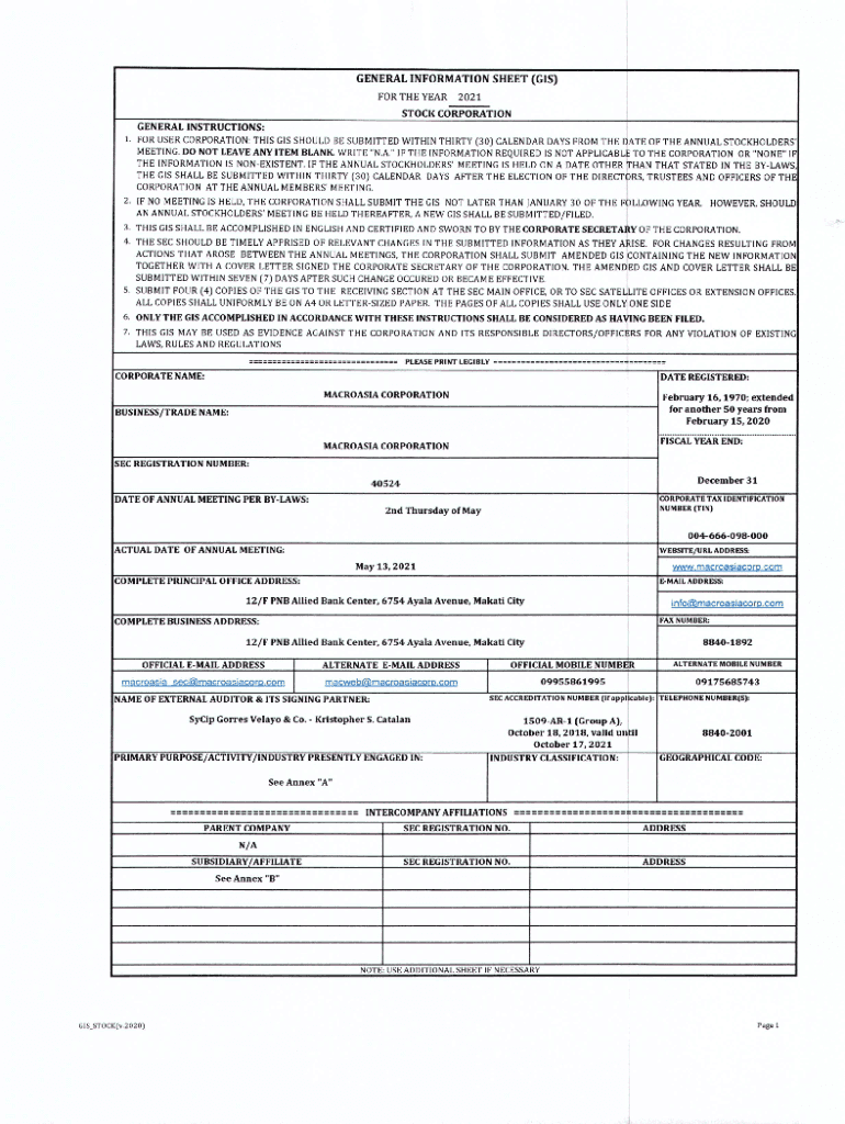 GENERALINFORMATIONFOR THE HARSHEST(GIS)2021ISTOCK CORPORATIONIGENERAL INSTRUCTIONS:1. FOR USER CORPORATION: These GIS SHOULD BE SUBMITTED WITHIN THIRTY (30) CALENDAR DAYS FROM THE GATE OF THE ANNUAL