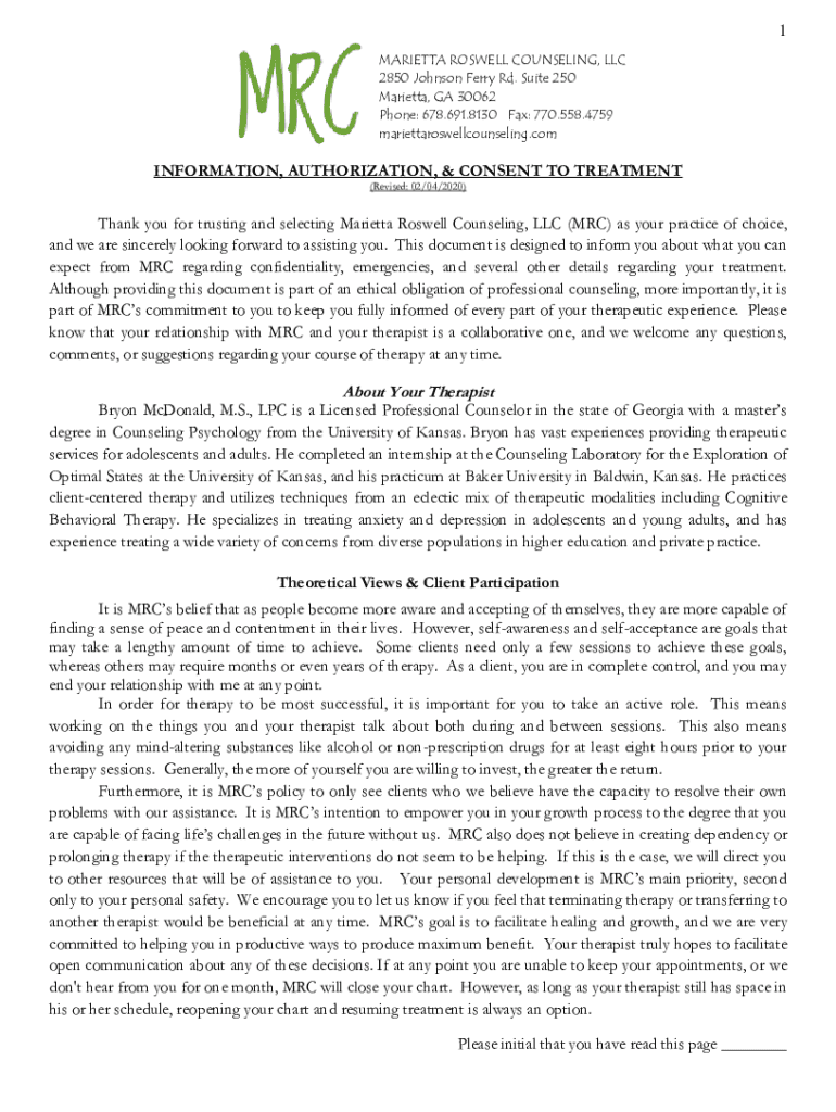 1 MARIETTA ROSWELL COUNSELING, LLC 2850 Johnson Ferry Rd. Suite 250 Marietta, GA 30062 Phone: 678.691.8130 Fax: 770.558.4759 mariettaroswellcounseling. Conformation, AUTHORIZATION, & CONSENT TO TREATMENT