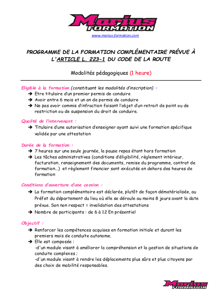 WWW.mariusformation.comPROGRAMME DE LA FORMATION COMPLEMENTARY PRV UE L\'ARTICLE L. 2231 DU CODE DE LA ROUTE Modality pedagogues (1 here) Eligible la formation (constituent LES modality inscription)
