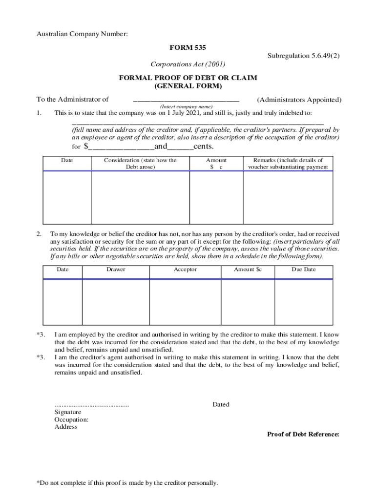 Australian Company Number: FORM 535 Subregulation 5.6.49(2)Corporations Act (2001) FORMAL PROOF OF DEBT OR CLAIM (GENERAL FORM) To the Administrator of 1. (Insert company name)(Administrators Appointed)This