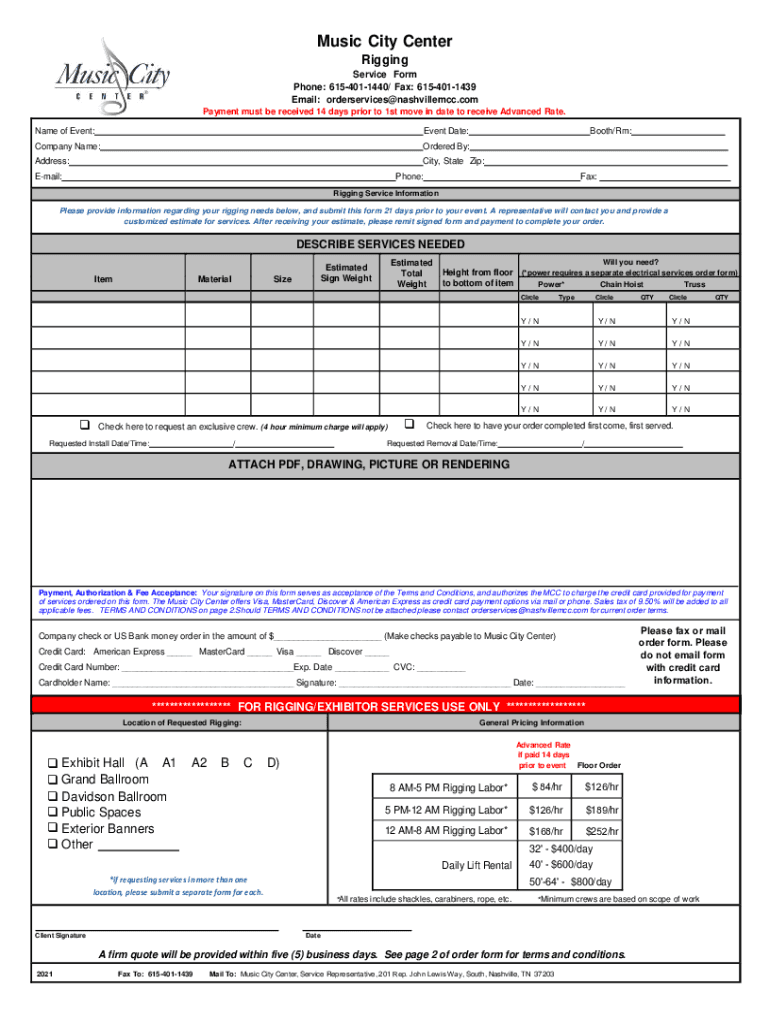 Music City Center Rigging Service Form Phone: 6154011440/ Fax: 6154011439 Email: orderservices@nashvillemcc.com Payment must be received 14 days prior to 1st move in date to receive Advanced Rate.