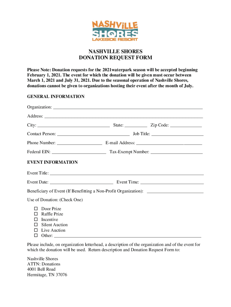 NASHVILLE SHORES DONATION REQUEST FORM Please Note: Donation requests for the 2021waterpark season will be accepted beginning February 1, 2021. The event for which the donation will be given must