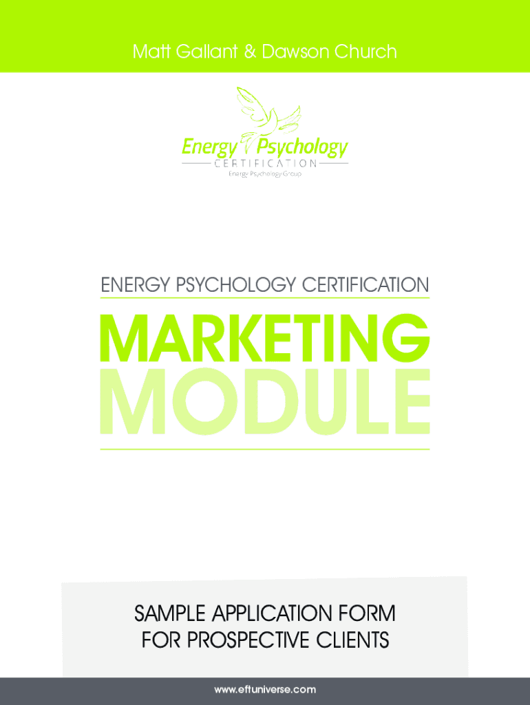 Matt Gallant & Dawson ChurchENERGY PSYCHOLOGY CERTIFICATIONSAMPLE APPLICATION FORM FOR PROSPECTIVE CLIENTS www.eftuniverse.com* 1. What is your first name?* 2. What are your initials?* 3. What is