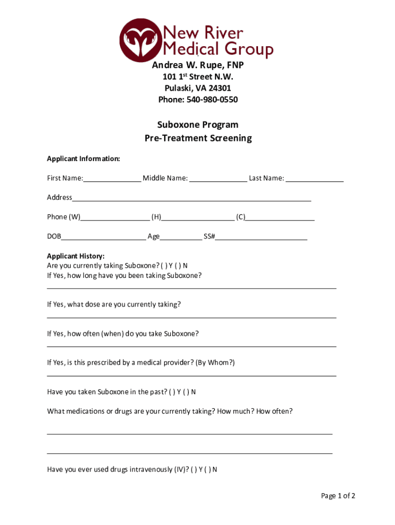 . Andrea W. Rule, FDP 101 1st Street N.W. Pulaski, VA 24301 Phone: 5409800550Suboxone Program PreTreatment Screening Applicant Information: First Name: Middle Name: Last Name: Address Phone (W) (H)