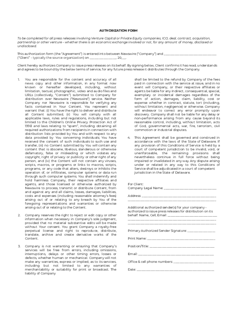 AUTHORIZATION FORM To be completed for all press releases involving Venture Capital or Private Equity companies, ICO, deal, contract, acquisition, partnership or other venture whether there is an