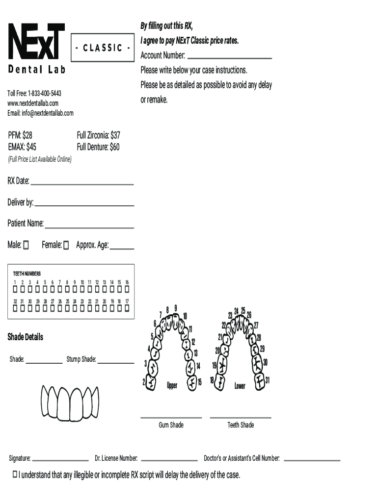 CLASSIC Toll Free: 18334005443 www.nextdentallab.com Email: info@nextdentallab.comPFM: $28EMAX: $45By filling out this RX, I agree to pay Next Classic price rates. Account Number: Please write below