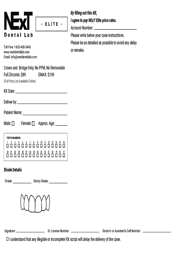 By filling out this RX, I agree to pay Next Elite price rates. Account Number: Please write below your case instructions. Please be as detailed as possible to avoid any delay or remake. ELITE Toll