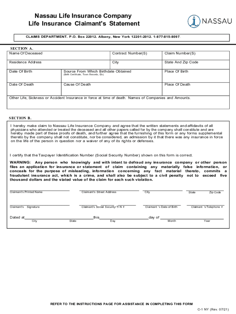 Nassau Life Insurance Company Life Insurance Claimant\'s Statement CLAIMS DEPARTMENT. P.O. Box 22012. Albany, New York 122012012. 18778158097.SECTION A. Name Of DeceasedContract Number(S)Claim Number(S)Residence