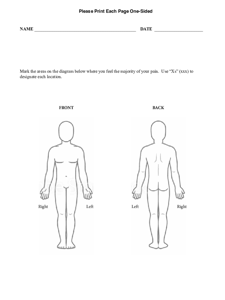 Please Print Each Page OneSidedNAME DATE Mark the areas on the diagram below where you feel the majority of your pain. Use XS (xxx) to designate each location.FRONTRightBACKLeftLeftRightThe following