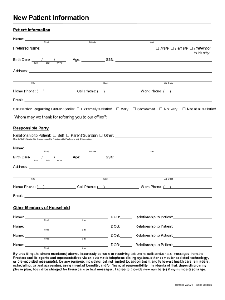New Patient Information Name:FirstMiddleLastPreferred Name: Birth Date:MM Male Female Prefer not to identify /DD/Voyage:SSN:Address: CityStateHome Phone: ()Cell Phone: (Zip Code)Work Phone: ()Email: