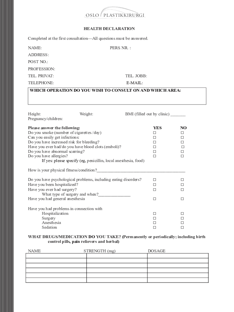 OSLO PLASTIKKIRURGI HEALTH DECLARATION Completed at the first consultation questions must be answered. NAME:PEERS. NR. :ADDRESS: POST NO.: PROFESSION: TEL. PRIVATE:TEL. JOB:TELEPHONE:EMAIL:WHICH OPERATION