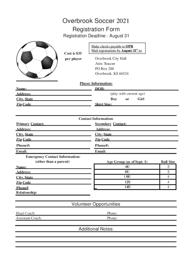 Overbook Soccer 2021 Registration Form Registration Deadline August 31Cost is $35 per place-name: Address: City, State Zip Preprimary Contact: Address: City, State Zip Codebase checks payable to OR