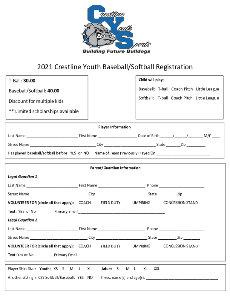 2021 Crest line Youth Baseball/Softball Registration Ball: 30.00Child will play:Baseball/Softball: 40.00Baseball: Ball Coach Pitch Little League Softball: Ball Coach Pitch Little LeagueDiscount for