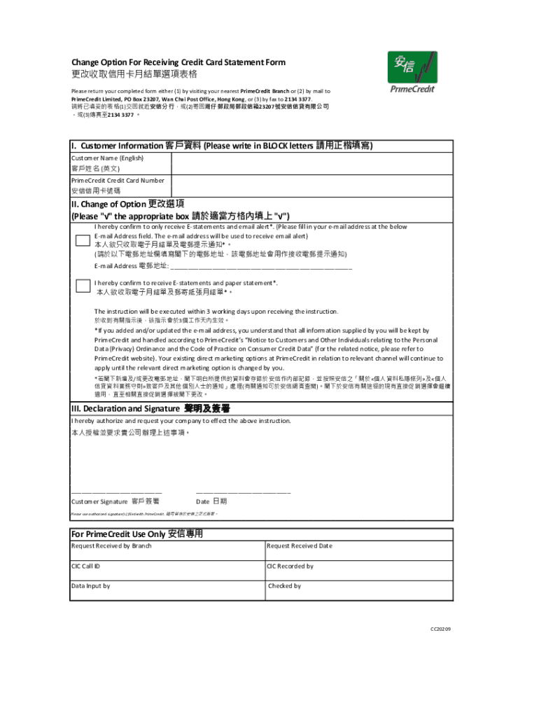 Change Option For Receiving Credit Card Statement Form Please return your completed form either (1) by visiting your nearest PrimeCredit Branch or (2) by mail to PrimeCredit Limited, PO Box 23207,