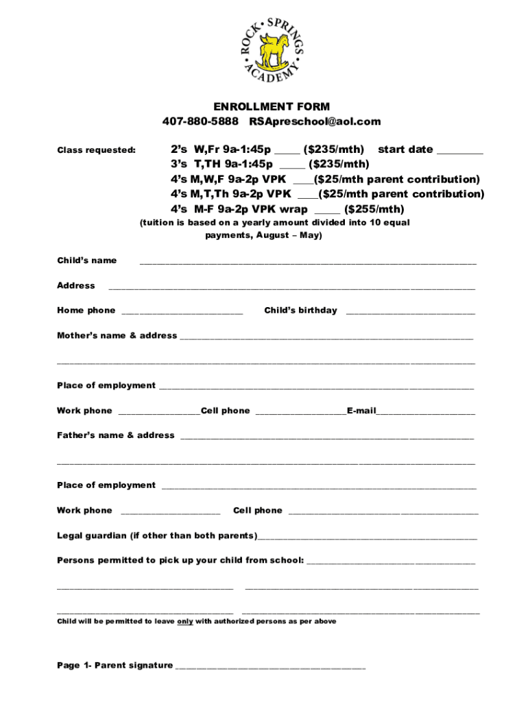 ENROLLMENT FORM 4078805888 RSA preschool aol.com Class requested:2s 3s 4s 4sW,For 9a1:45p ($235/MTV) start date T, TH 9a1:45p ($235/MTV) M, W, F 9a2p VP ($25/MTV parent contribution) M, T, The 9a2p