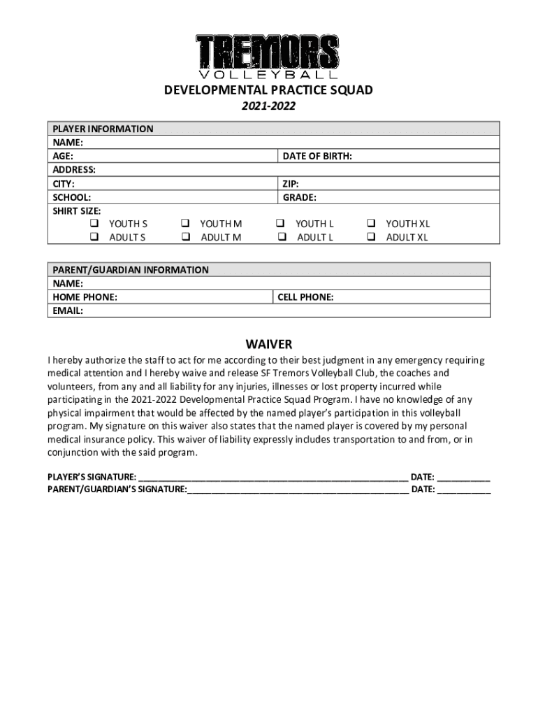 DEVELOPMENTAL PRACTICE SQUAD 20212022 PLAYER INFORMATION NAME: AGE: ADDRESS: CITY: SCHOOL: SHIRT SIZE: YOUTH S ADULTS DATE OF BIRTH: ZIP: GRADE: YOUTH M ADULT PARENT/GUARDIAN INFORMATION NAME: HOME