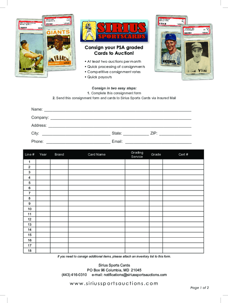 Consign your PSA graded Cards to Auction! Consign in two easy steps: 1. Complete this consignment form 2. Send this consignment form and cards to Sirius Sports Cards via Insured Misname: Company:
