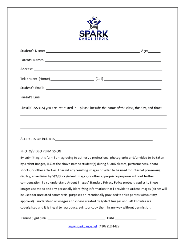 StudentsName: Age: ParentsNames: Address: Telephone:(Home) (Cell) StudentsEmail: Parenteral: ListallCLASS(ES)youareinterestedinpleaseincludethenameoftheclass, the day, anytime: ALLERGIESORINJURIES