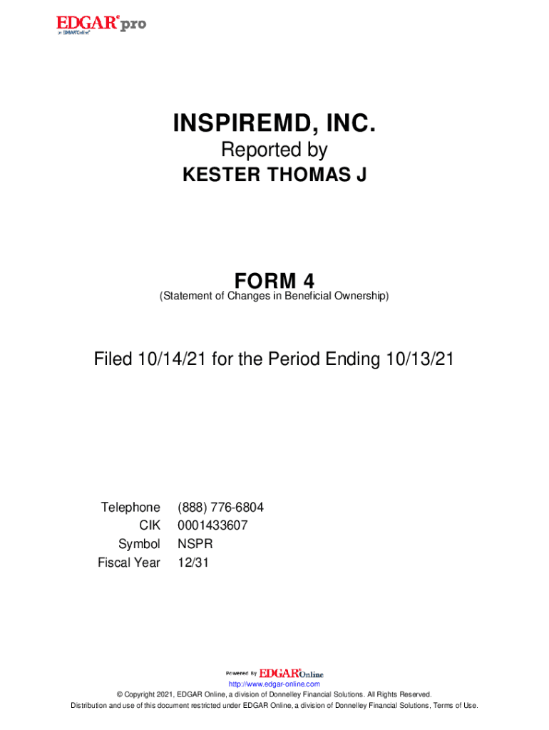 Any insider who has conducted transactions in inspiremd inc stock, such as officers, directors, and major shareholders, are required to file inspiremd inc form 4.