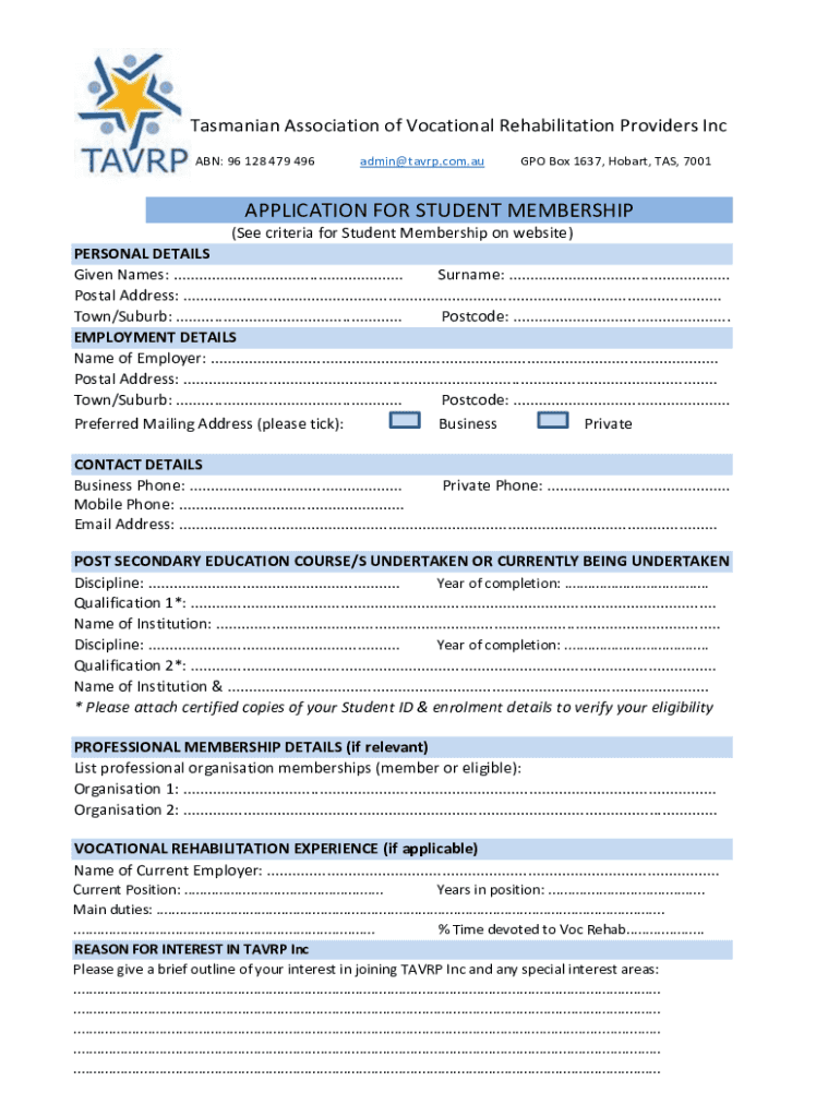 Tasmanian Association of Vocational Rehabilitation Providers Inc ABN: 96 128 479 496admin@tavrp.com.auGPO Box 1637, Hobart, TAS, 7001APPLICATION FOR STUDENT MEMBERSHIP (See criteria for Student Membership