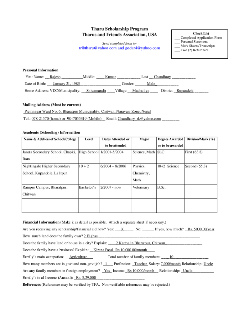 The Tharu scholarship program tharus application form will require information such as personal details, educational background, financial information, and academic achievements.