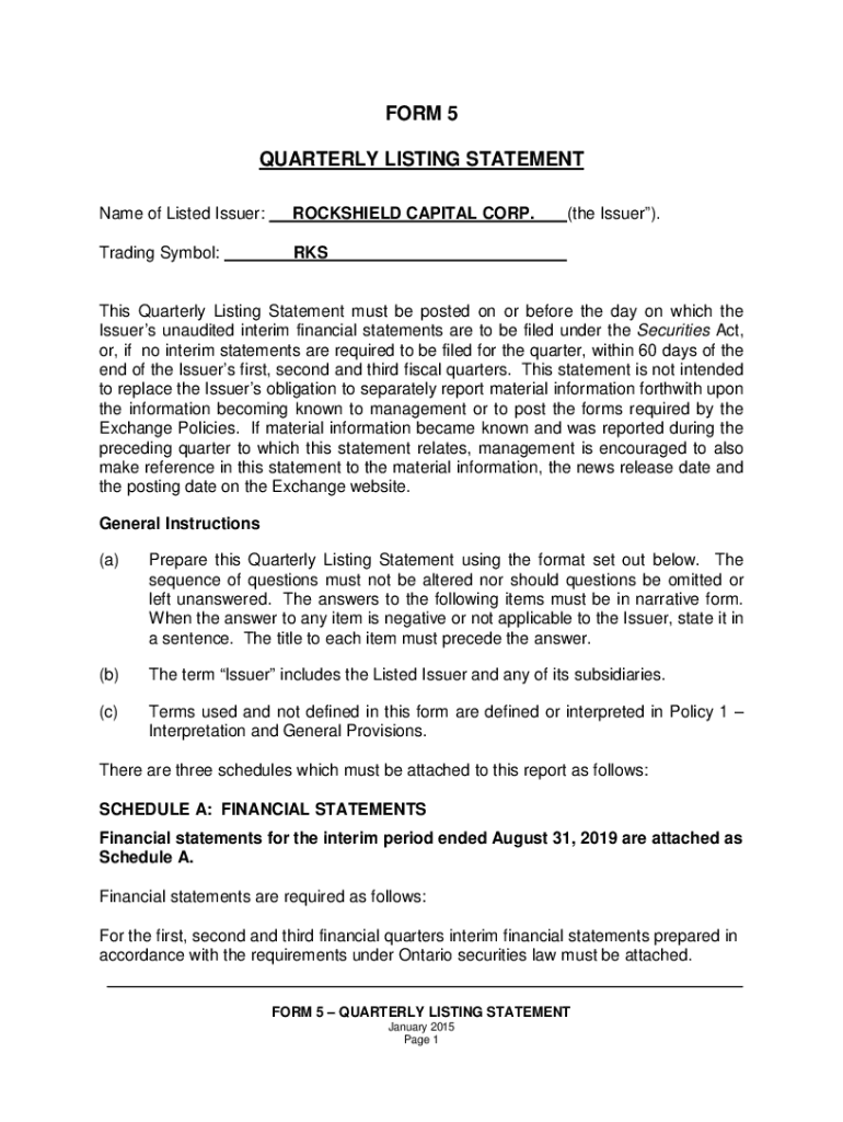 FORM 5 QUARTERLY LISTING STATEMENT Name of Listed Issuer:ROCKSHIELD CAPITAL CORP. Trading Symbol:RMS(the Issuer). This Quarterly Listing Statement must be posted on or before the day on which the
