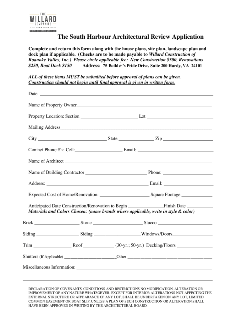 The South Harbor Architectural Review Application Complete and return this form along with the house plans, site plan, landscape plan and dock plan if applicable. (Checks are to be made payable to