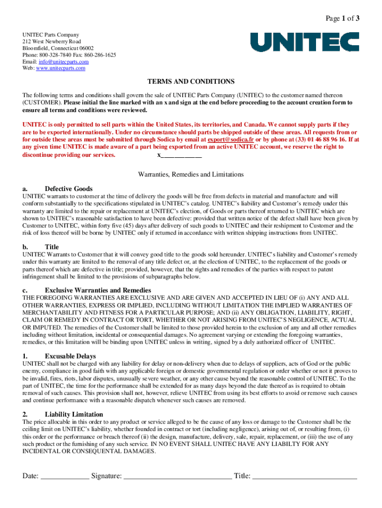 Page 1 of 3 UNITED Parts Company 212 West Newberry Road Bloomfield, Connecticut 06002 Phone: 8003287840 Fax: 8602861625 Email: info@unitecparts.com Web: www.unitecparts.comTERMS AND CONDITIONS The
