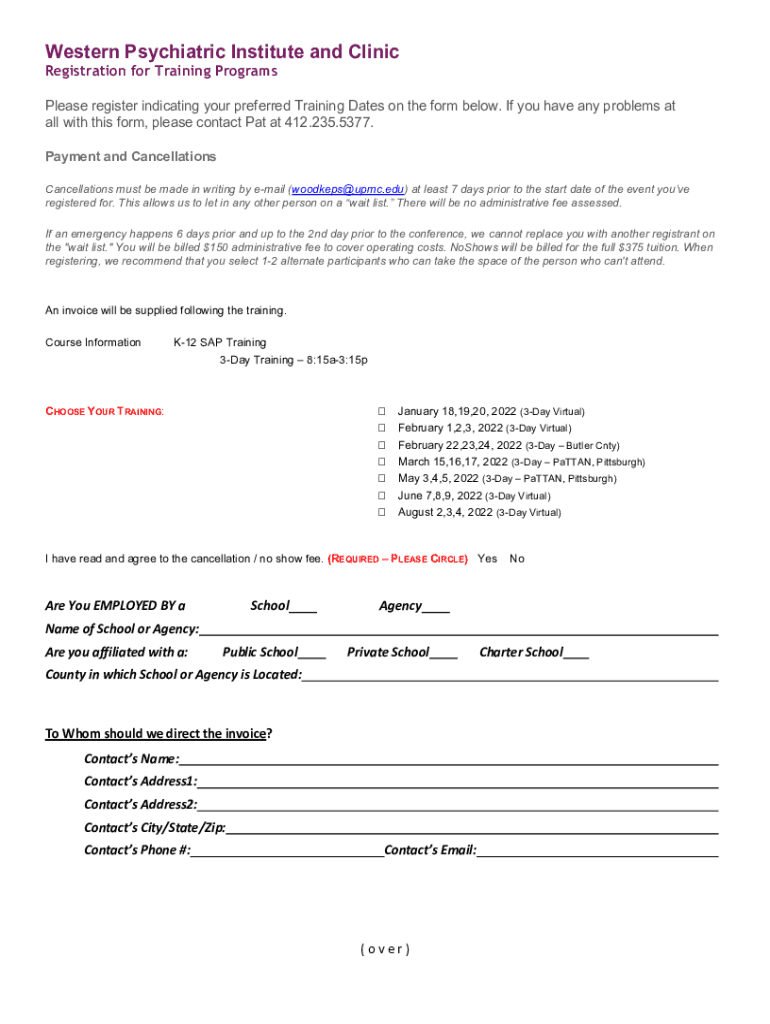 Western Psychiatric Institute and Clinic Registration for Training ProgramsPlease register indicating your preferred Training Dates on the form below. If you have any problems at all with this form,