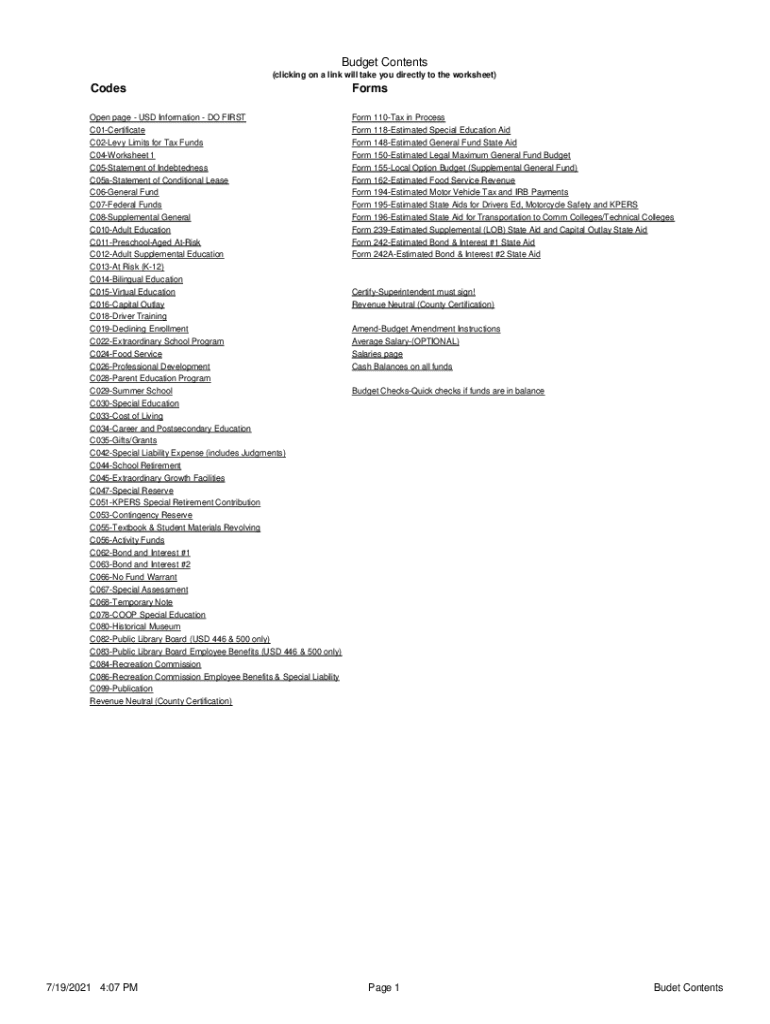 Budget Contents (clicking on a link will take you directly to the worksheet)CodesFormsOpen page USD Information DO FIRST C01Certificate C02Levy Limits for Tax Funds C04Worksheet 1 C05Statement of