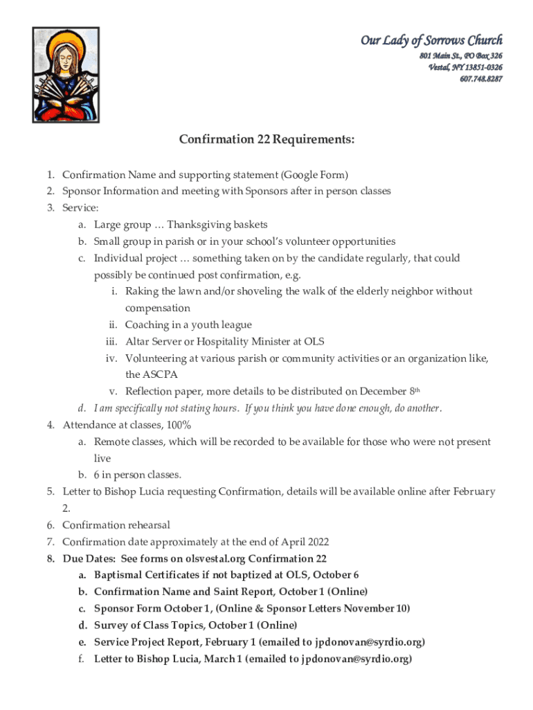 Confirmation 22 Requirements: 1. Confirmation Name and supporting statement (Google Form) 2. Sponsor Information and meeting with Sponsors after in person classes 3. Service: a. Large group Thanksgiving