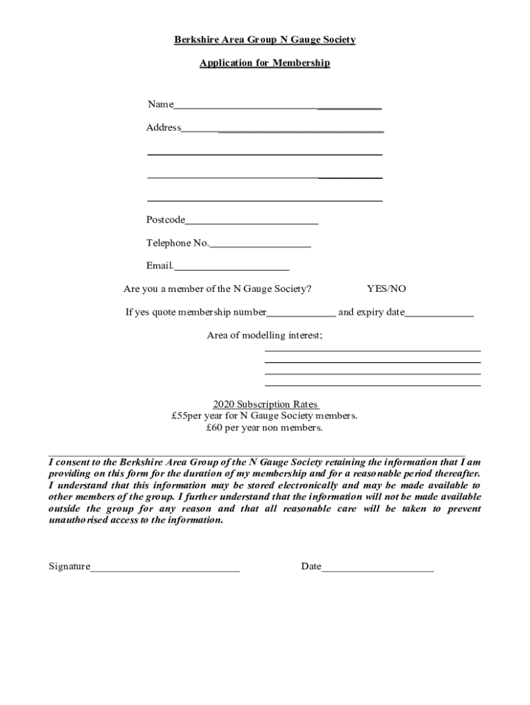 Berkshire Area Group N Gauge Society Application for MembershipName Address Postcode Telephone No. Email. Are you a member of the N Gauge Society? If yes quote membership numbers/NO and expiry catered