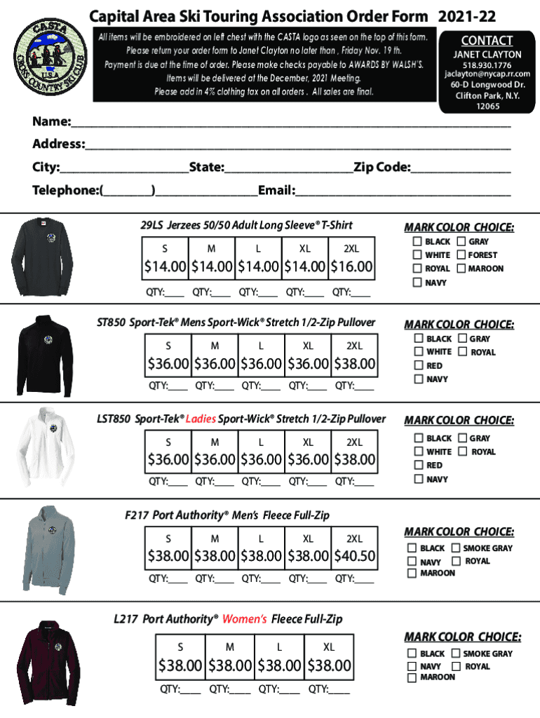 Capital Area Ski Touring Association Order Form 202122 All items will be embroidered on left chest with the CAST logo as seen on the top of this form. Please return your order form to Janet Clayton