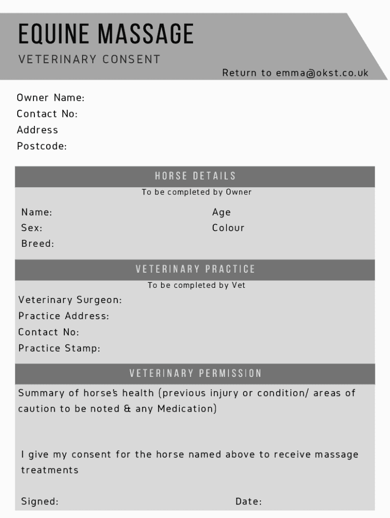 EQUINE MASSAGE VETERINARY CONSENTReturn to Emma oust.co.owner Name: Contact No: Address Postcode:HORSE DETAILS To be completed by Overcame: Sex: Breed:Age ColourVETERINARY PRACTICE To be completed