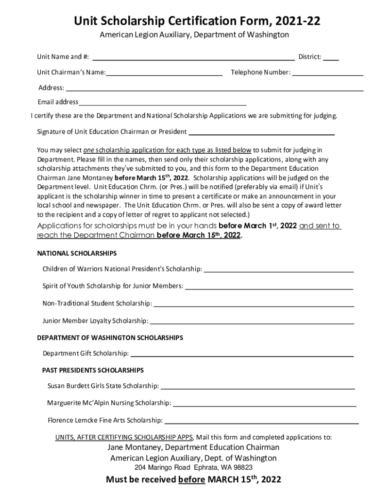 Unit Scholarship Certification Form, 202122 American Legion Auxiliary, Department of Washington Unit Name and #: Unit Chairman Name:District:Telephone Number:Address: Email address I certify these
