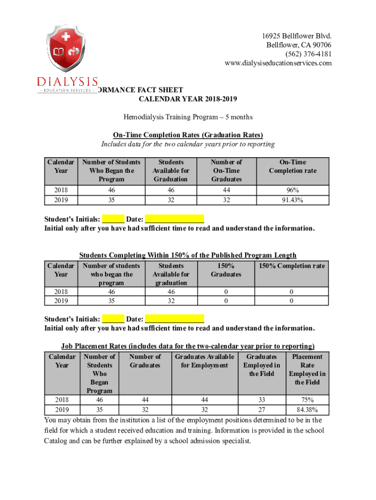16925 Bellflower Blvd. Bellflower, CA 90706 (562) 3764181 www.dialysiseducationservices.com SCHOOL PERFORMANCE FACT SHEET CALENDAR YEAR 20182019 Hemodialysis Training Program 5 months Onetime Completion