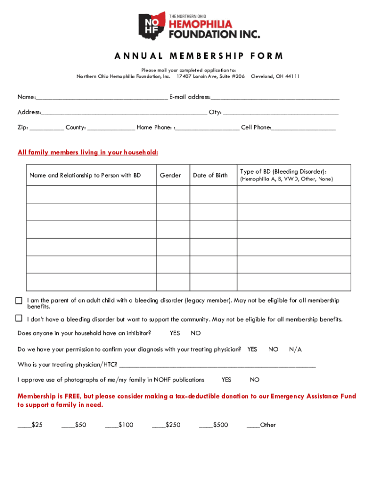 ANNUAL MEMBERSHIP FORM Please mail your completed application to: Northern Ohio Hemophilia Foundation, Inc. 17407 Lorain Ave, Suite #206Cleveland, OH 44111Name: Email address: Address: City: Zip: