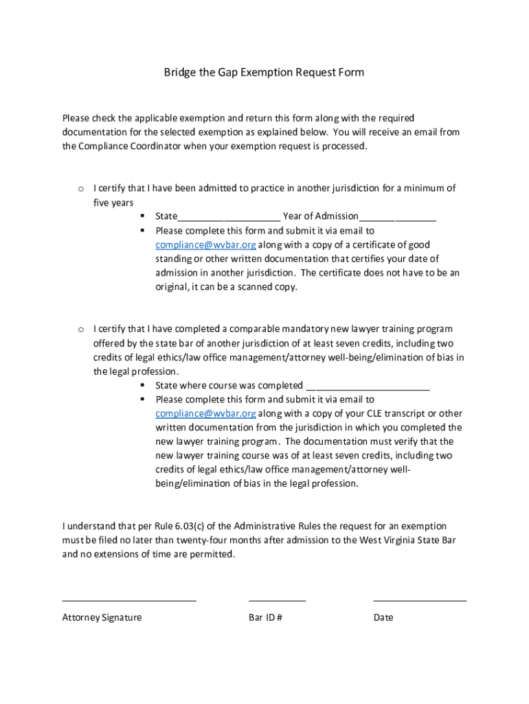 Bridge the Gap Exemption Request Formulas check the applicable exemption and return this form along with the required documentation for the selected exemption as explained below. You will receive