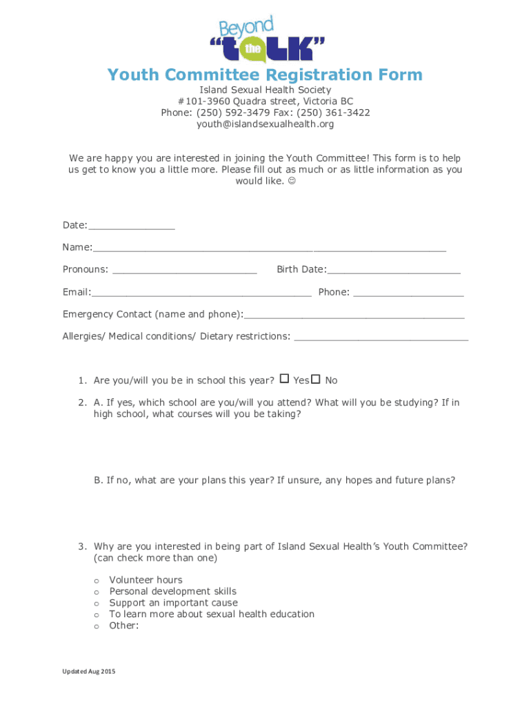 Youth Committee Registration Form Island Sexual Health Society #1013960 Quadrat street, Victoria BC Phone: (250) 5923479 Fax: (250) 3613422 youth islandsexualhealth. Argue are happy you are interested