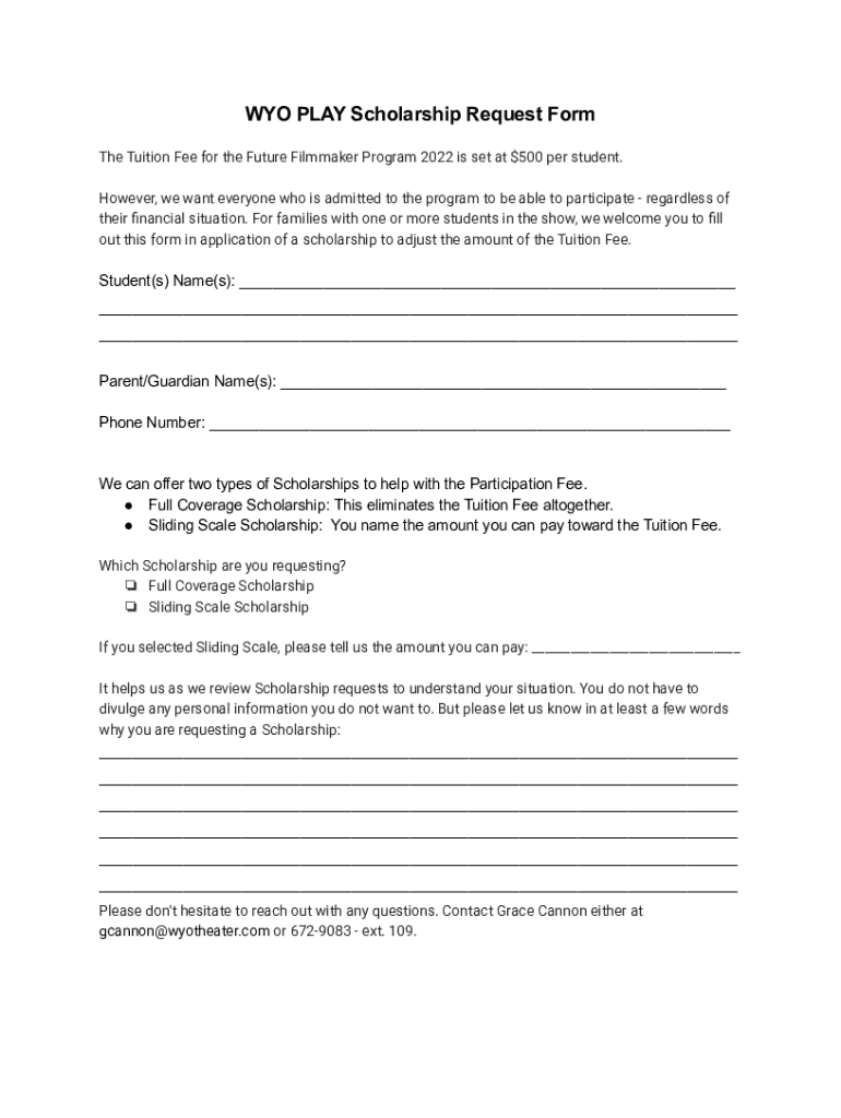 WYO PLAY Scholarship Request Form The Tuition Fee for the Future Filmmaker Program 2022 is set at $500 per student. However, we want everyone who is admitted to the program to be able to participate