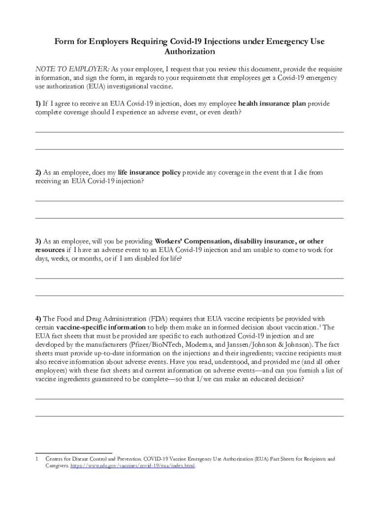 Form for Employers Requiring COVID-19 Injections under Emergency Use Authorization NOTE TO EMPLOYER: As your employee, I request that you review this document, provide the requisite information, and