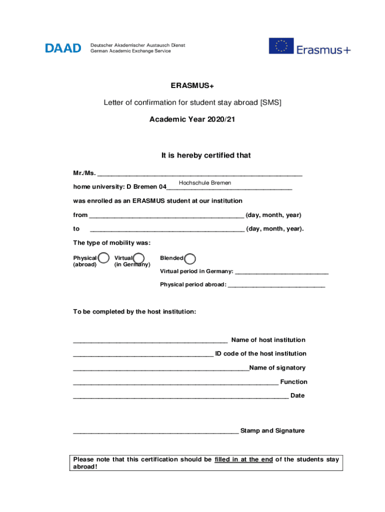 ERASMUS+ Letter of confirmation for student stay abroad SMS Academic Year 2020/21It is hereby certified that Mr./Ms. Hochschule Bremen home university: D Bremen 04 was enrolled as an ERASMUS student