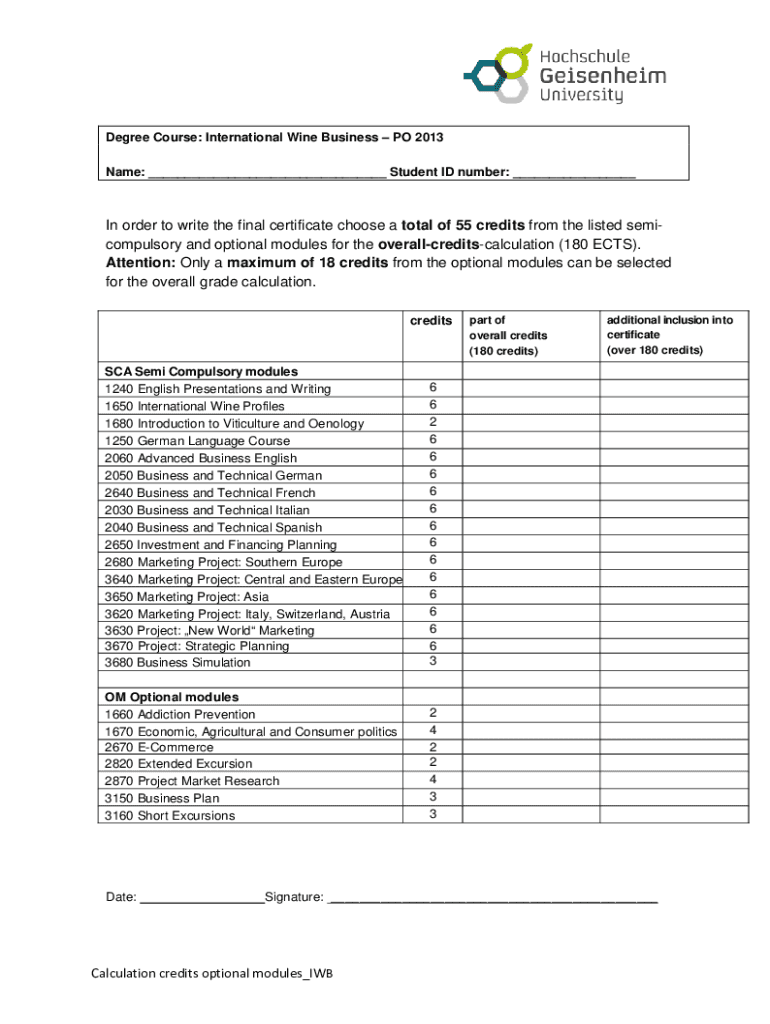 Degree Course: International Wine Business PO 2013 Name: Student ID number: In order to write the final certificate choose a total of 55 credits from the listed semicompulsory and optional modules