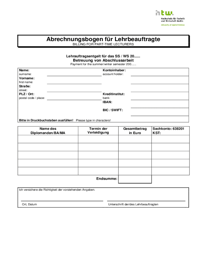 Abrechnungsbogen for Lehrbeauftragte BILLING FOR PART TIME LECTURERSLehrauftragsentgelt for was SS / WS 20...... Betraying on Abschlussarbeit Payment for the summer/winter semester 200...... Name:Kontoinhaber:surname:account