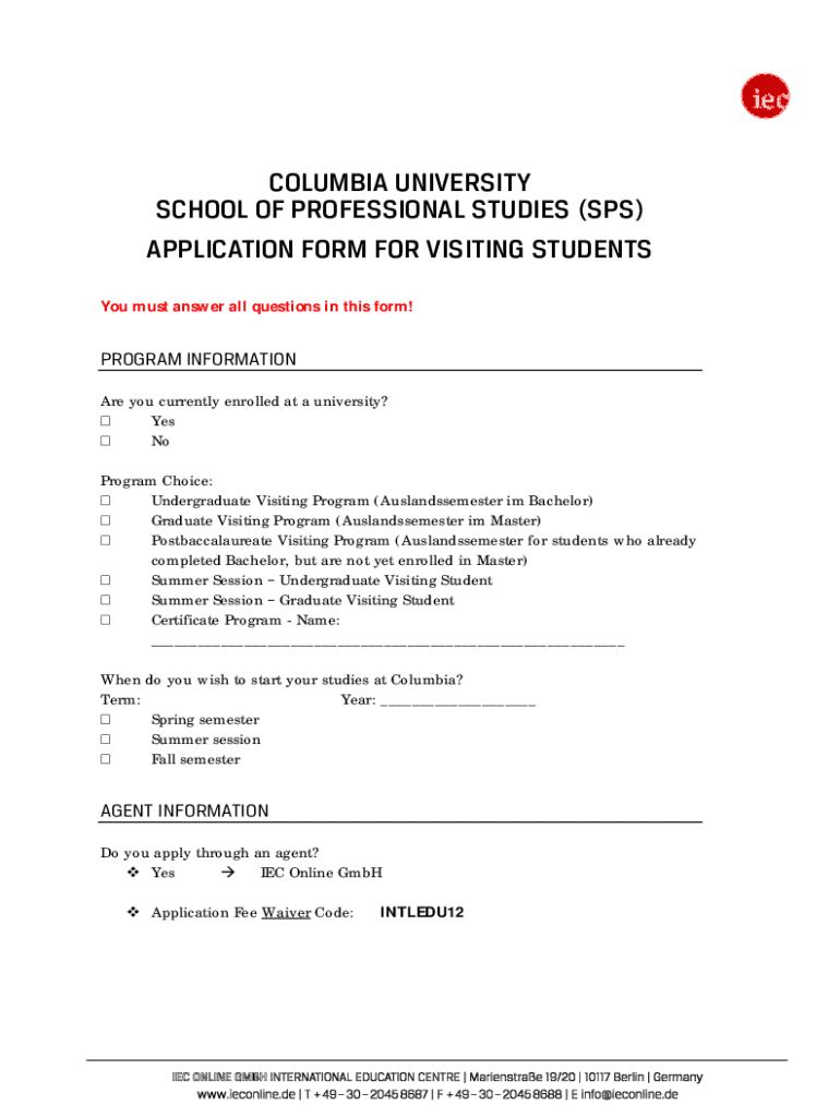 COLUMBIA UNIVERSITY SCHOOL OF PROFESSIONAL STUDIES (SPS) APPLICATION FORM FOR VISITING STUDENTS You must answer all questions in this form!PROGRAM INFORMATION Are you currently enrolled at a university?