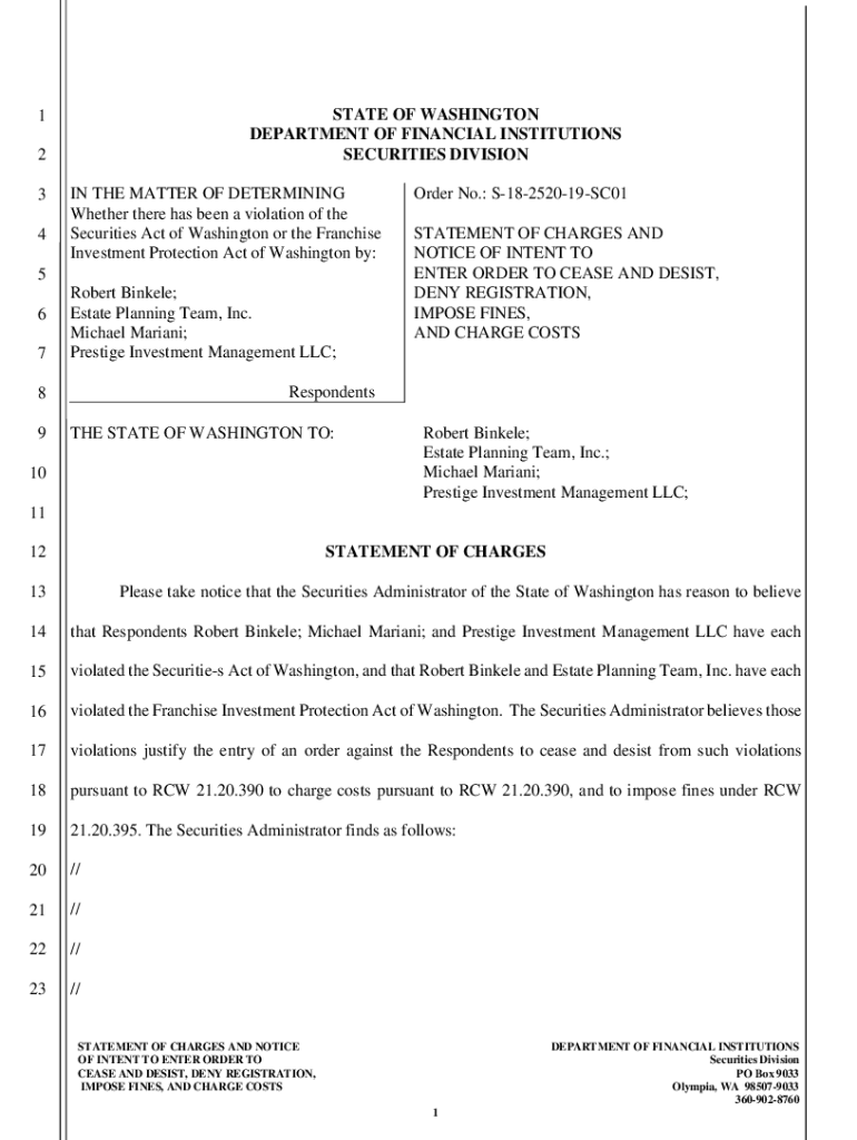 STATE OF WASHINGTON DEPARTMENT OF FINANCIAL INSTITUTIONS SECURITIES DIVISION1 2 3 4IN THE MATTER OF DETERMINING Whether there has been a violation of the Securities Act of Washington or the Franchise
