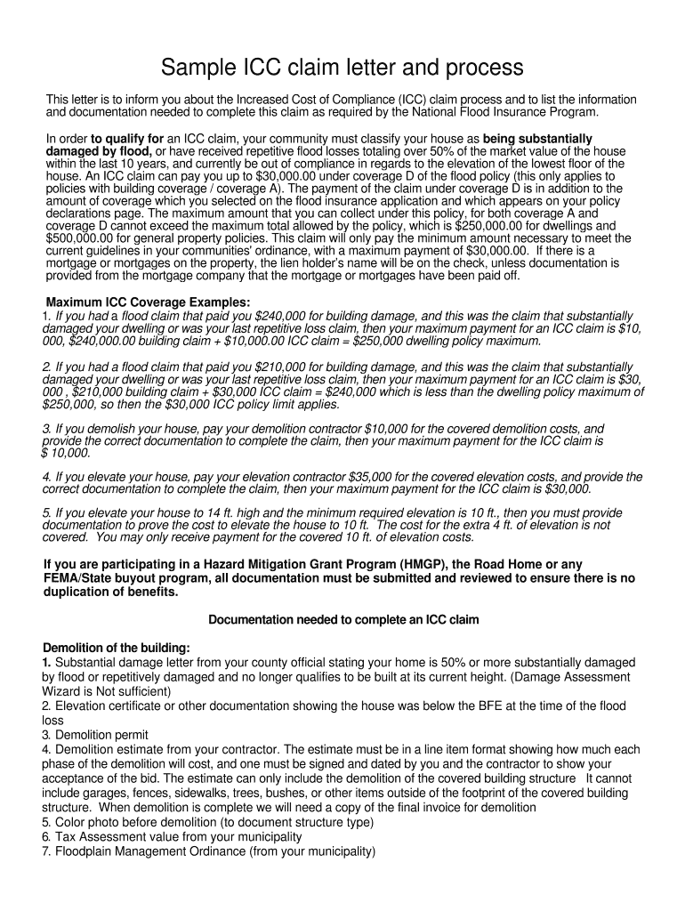 This letter is to inform you about the Increased Cost of Compliance (ICC) claim process and to list the information